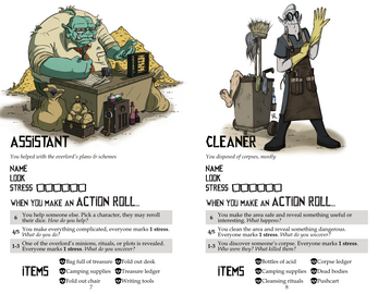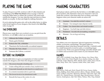 Each player creates their own character, defined by the job they performed under the old overlord. Players take turns generating random encounters like hallways full of traps, underground lakes full of beasts, or other denizens, and then drawing them to create a map. Characters will accumulate stress as they explore the dungeon, and your characters will occasionally take breaks to recover and reminisce about your life here.