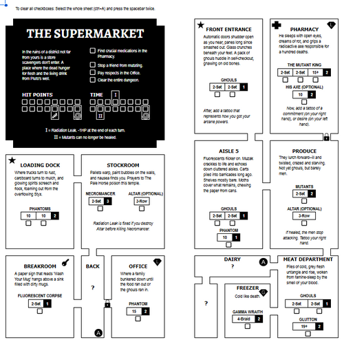 I am a huge fan of Mikey Hamm's game, Two-Hand Path, the solo roll and write post-apocalyptic dungeon crawler. I wanted to try my hand at making some digital sheets for all the dungeons inside. I made them using Google Sheets and they should be easy to download and customize to your heart's content! All you need is a character sheet and some dice!